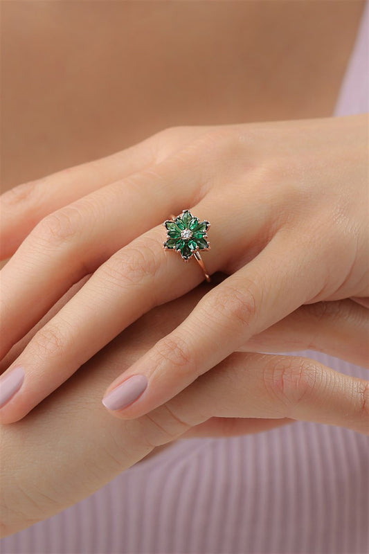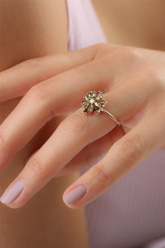Silver Green Gemstone Lotus Camellia Flower Ring