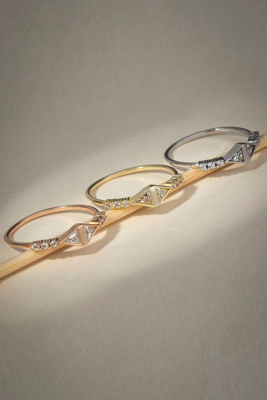 Anillo con diseño de piedras preciosas triangulares de oro macizo