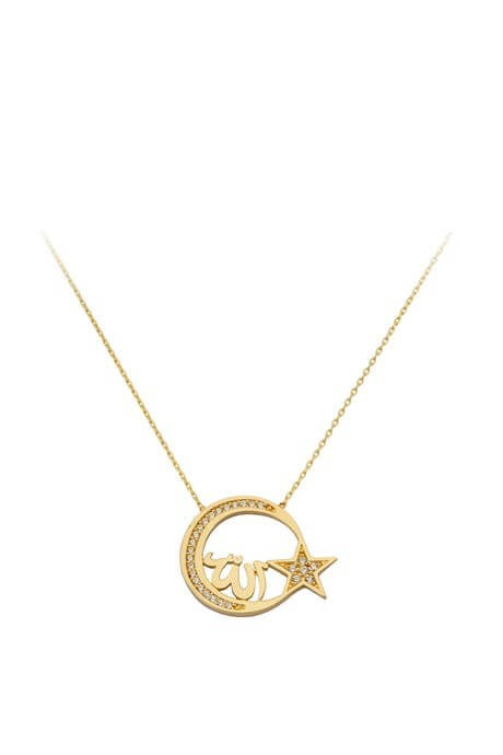 The necklace is crafted from 14K yellow gold, a precious metal that is known for its durability and luster. The pendant features a crescent moon and star, two symbols that are often associated with Islam. The word "Allah" is written in Arabic calligraphy on the crescent moon, adding a touch of elegance and spirituality to the necklace.