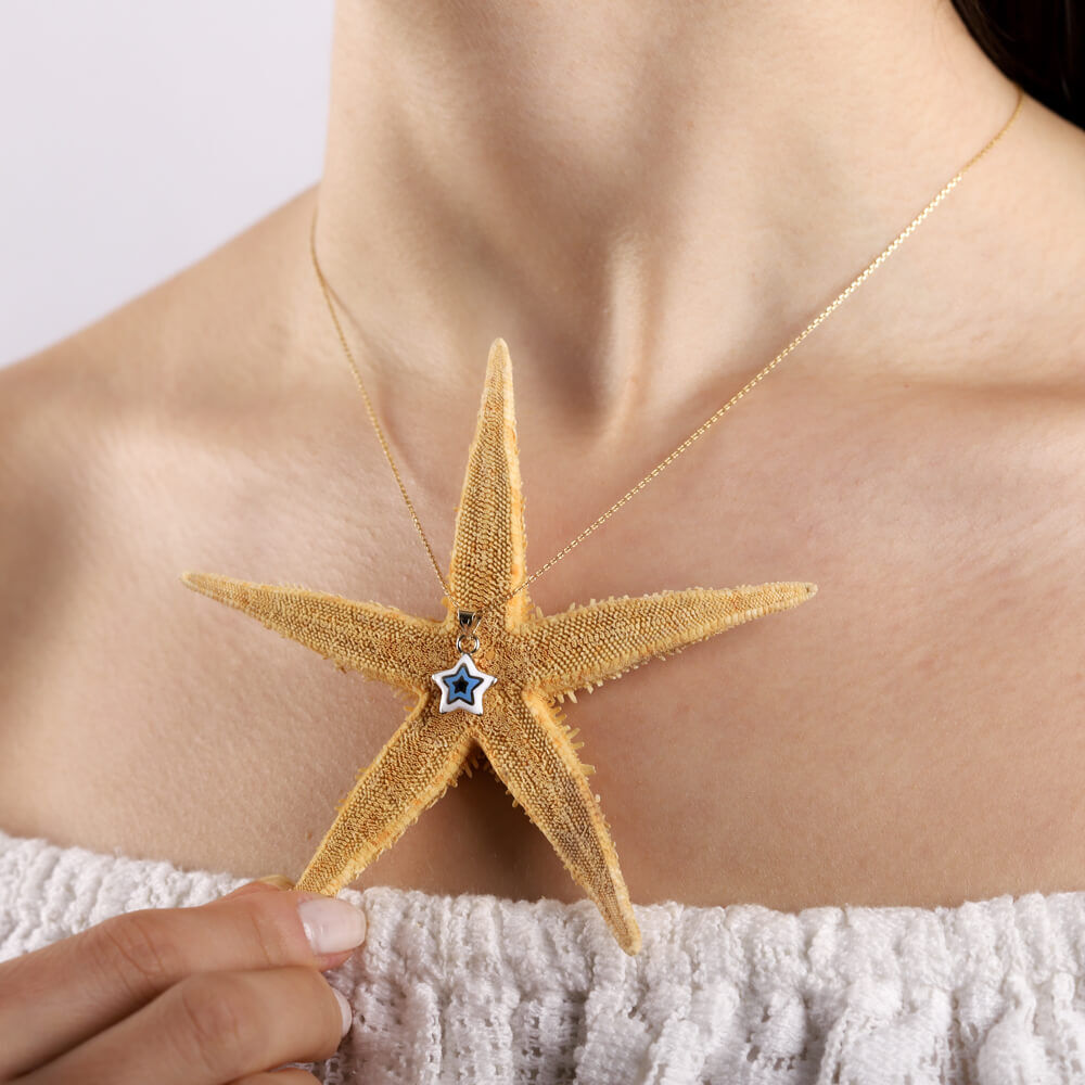 14K Evil Eye Solid Gold Necklace Enamel Star Design