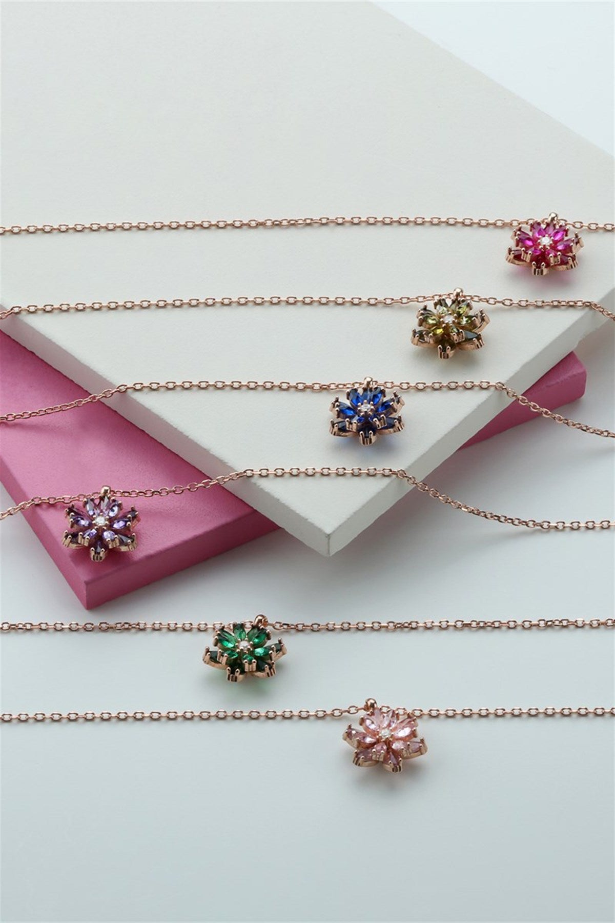 Silver Pink Gemstone Lotus Camellia Flower Necklace