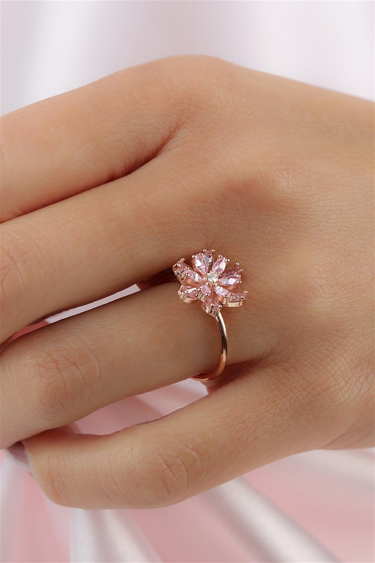 Silver Pink Gemstone Lotus Camellia Flower Ring